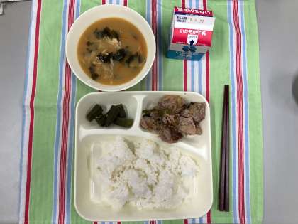 豚肉の甘辛焼き、みそ汁、オクラのおかかいため、ごはん、牛乳