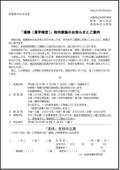 今週の国語の授業にて、「漢検(漢字検定)」の本年度2回目の校内実施に関するお知らせと案内をプリントにて配付させていただきました。