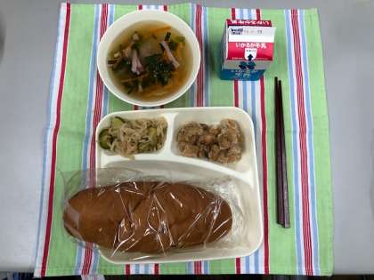 鶏肉のからあげ、とうがんの中華スープ、切り干しだいこんの辛みづけ、パン、牛乳