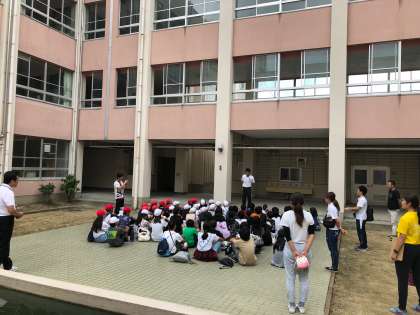 中庭で、一旦集合して、中学の先生から説明を聞いています。