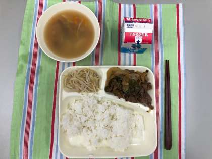 プルコギ、トック、もやしの甘酢あえ、ごはん、牛乳