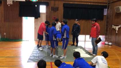 限られた資材で、負傷者を安全に搬送する方法を教えてもらい、実践してみました。