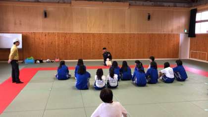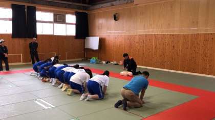 続いて、「心肺蘇生訓練」に取り組んでいる様子です。「胸骨圧迫(心臓マッサージ)」の方法や「AED(自動体外式除細動器)」の使用方法を学び、実践しました。