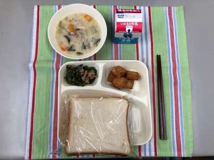 はくさいのクリーム煮、あつあげのごまじょうゆかけ、豚肉と三度豆のオイスターソースいため、食パン、牛乳