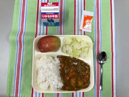 ポークカレーライス(米粉)、キャベツのサラダ、ノンエッグドレッシング、りんご、牛乳