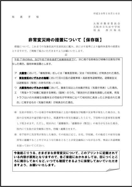 今後起こりうる、さまざまな非常変災について、このプリントに記載されている内容が原則となりますので、各ご家庭におかれましては、目につくところに掲示しておくなど、いつでも確認できるように保管しておいていただきますよう、お願いいたします。