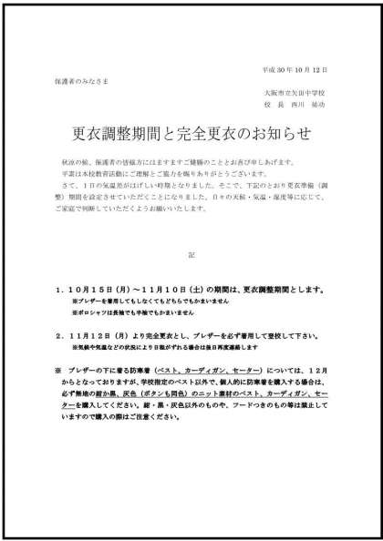 【H30.10.12】更衣調整期間と完全更衣のお知らせ