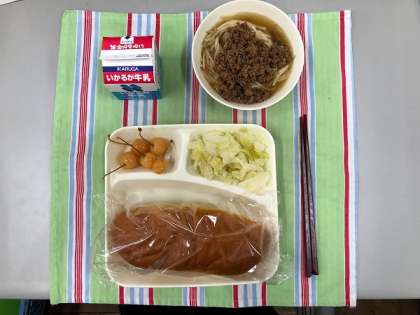 タンタンめん、キャベツの甘酢づけ、さくらんぼ(缶)、パン、牛乳