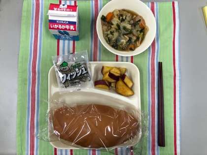 豚肉といかの中華煮、大学いも、ミニフィッシュ、パン、牛乳