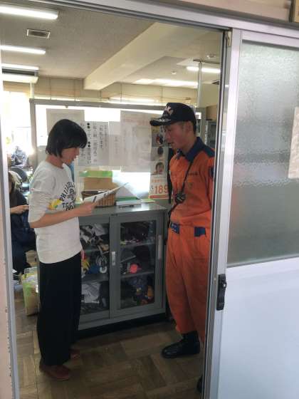 指導に来ていただいた東住吉消防署の方からは、「火災の場合は、とにかく『煙』を吸わないことが一番」とのお話をいただきました。