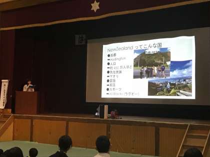 1年生の発表の後、3年生の村嶋さんが、この夏休みに区の事業でニュージーランドに3週間のホームステイに行ってきた様子を報告してくれました。