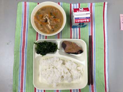 なまりぶしのしょうが煮、みそ汁、ほうれん草のごまあえ、ごはん、牛乳
