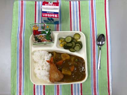 えびフライカレーライス、きゅうりとコーンのサラダ、豆こんぶ、牛乳