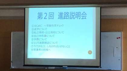 主な内容は、あさって(10日)にされている「第2回進路説明会」とほぼ同じ内容で、進路指導担当の廣瀬先生からのお話を聞きました。