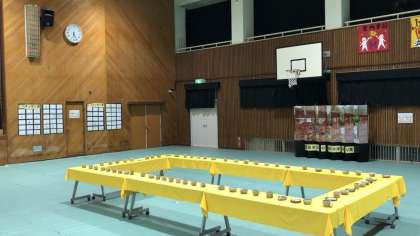 本日の午後から準備を行ってまいりましたが、下の写真のように、体育館内は明日の展示発表を待つのみとなっています。