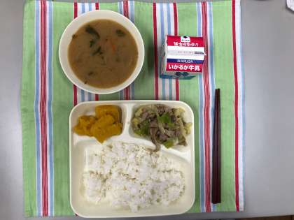 豚肉とまいたけのいためもの、つみれ汁、かぼちゃういろう、ごはん、牛乳
