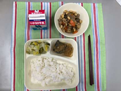さごしのおろししょうゆかけ、五目豆、はくさいの甘酢あえ、ごはん、牛乳