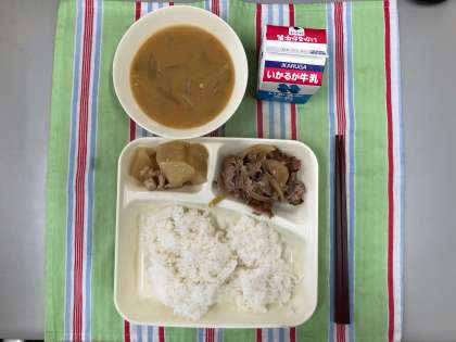 豚肉のしょうが焼き、みそ汁、だいこんの煮もの、ごはん、牛乳