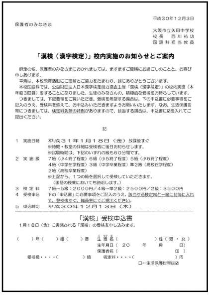 今週の国語の授業にて、「漢検(漢字検定)」の本年度3回目の校内実施に関するお知らせと案内をプリントにて配付させていただきました。