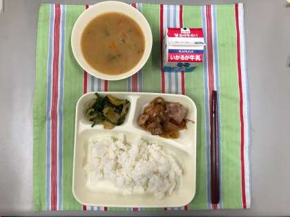 鶏肉の甘辛焼き、みそ汁、きくなとはくさいのごまあえ、ごはん、牛乳