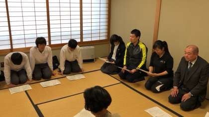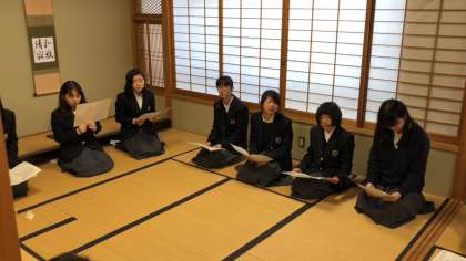 約20名の希望者と先生たちが参加しましたが、まず最初に資料をみんなで音読しながら、「茶道」について学びました。