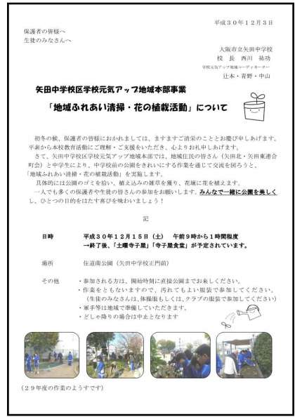 明日(15日の土曜日)朝9時〜10時、正門前の公園を中心に、「地域ふれあい清掃・花の植栽活動」の取組が行われます。