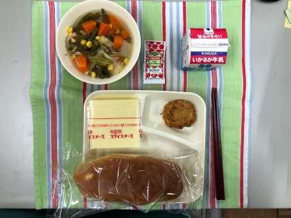 とうふハンバーグ(ケチャップ付)、スープ煮、スライスチーズ、さつまいもパン、牛乳