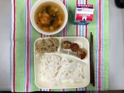 あげシューマイ、えびととうふのスープ、もやしとコーンのピリ辛あえ、ごはん、牛乳