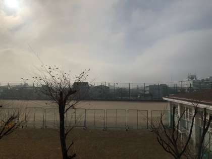下の写真は、校長室から運動場を写したものですが、運動場の奥が見えません。