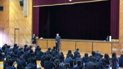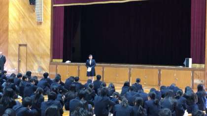 校長先生からは、今年(2018年)を振り返って、さまざまな災害が起こったことから、今後起こりうるであろう「南海トラフ大地震」に向けて、自覚をもって備えていかないといけないことを考えさせられたことや、さまざまな生徒会活動が充実したことから、みんなで策定した「いじめ三原則」についてや、年末に地域の一人暮らしのお年寄りのみなさんに送ったクリスマスカードの取組などについてお話がありました。特に、「クリスマスカード」の取組については、受け取られたみなさんから、学校にお礼の電話が入っていることを紹介されました。そして、最後に、それぞれ個人が、この1年を振り返って、来年のさらなる成長につなげていくようにとのお話もありました。