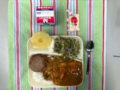 豚肉と金時豆のカレーライス、焼きハンバーグ、ごぼうサラダ(マヨネーズ付)、パインアップル(缶)、牛乳