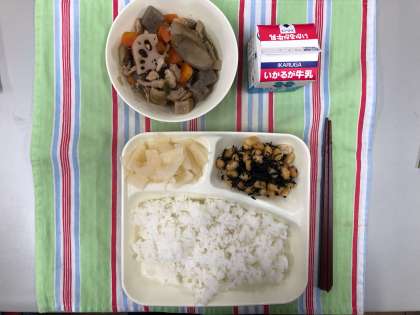 筑前煮、ひじき豆、だいこんのゆず風味、ごはん、牛乳
