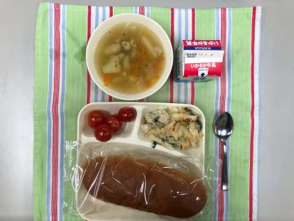 ほたて貝のグラタン、だいこんのスープ、プチトマト、パン、牛乳