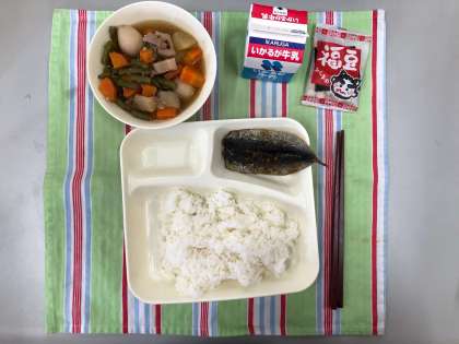 いわしのしょうがじょうゆがけ、含め煮、いり大豆、ごはん、牛乳