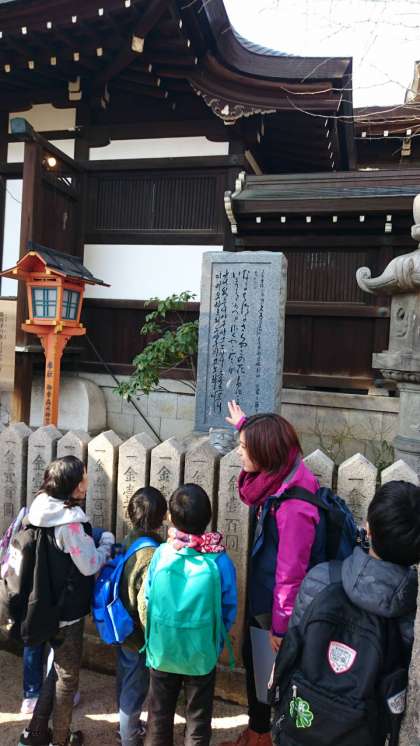 コリアタウンに到着した一行は、入口付近にある「御幸森神社」にてソンセンニムから石碑に刻まれた日本と朝鮮半島との関わりについて説明がありました。