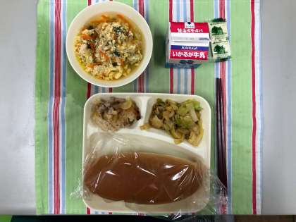 中華おこわ、卵スープ、キャベツのオイスターソースいため、パン、牛乳