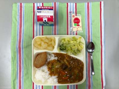 ポークカレーライス、一口トンカツ、グリーンサラダ、洋なし(缶)