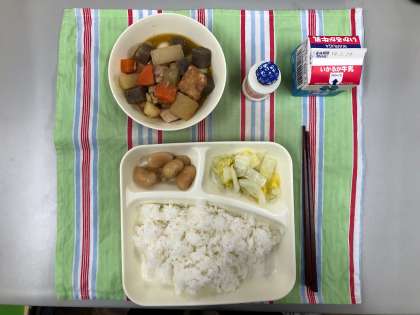 関東煮、はくさいの甘酢づけ、白花豆の煮もの、はっ酵乳、ごはん、牛乳