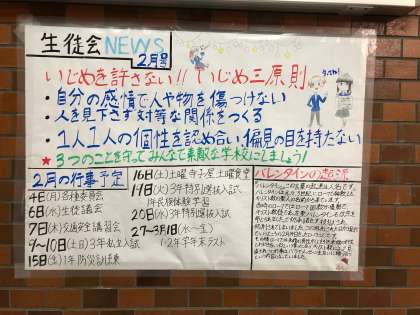 今回は、昨年生徒会で策定した「いじめ3原則」や「バレンタインの起源」などのついて掲載されています。