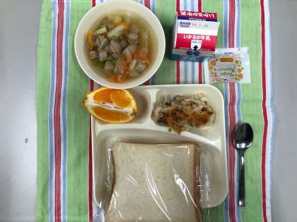 押し麦のグラタン、スープ、デコポン、食パン、牛乳