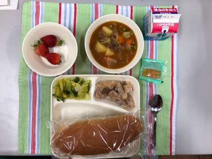 フライドチキン、カレーシチュー、春のカラフルソテー、いちご、パン、牛乳