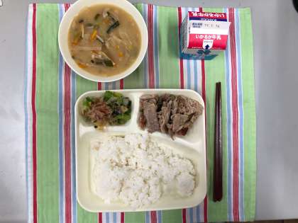豚肉のごまだれ焼き、みそ汁、こまつなのおひたし、ごはん、牛乳
