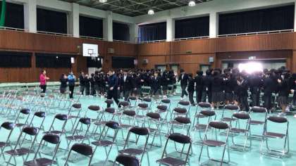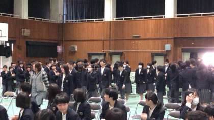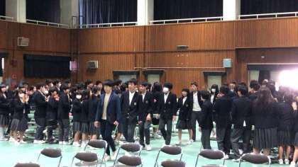 本日1時間目、生徒会主催の「3年生を送る会」が体育館で開催され、全校生徒が参加して行われました。