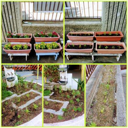 玄関や正門前の草花の様子です。少しずつ成長しています。