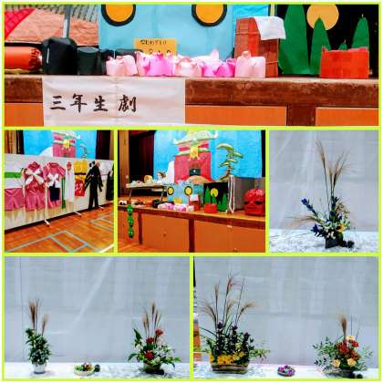 3年生の劇の背景と衣装の展示物と季節感溢れる生け花です。