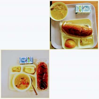 10月3日(金)、今日の給食献立は、黒糖パン、白菜のピクルス、リンゴ、鶏肉とさつまいものシチュー、牛乳です。エネルギー:823kcal。たんぱく質:31.7g。脂質:23.7g。脂質:109.0gです。