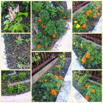 10月8日(水)朝、玄関前や正門前の草花(マリーゴールドとヤリケイトウ)の様子です。草花にとっての最適気温になったのかな!?