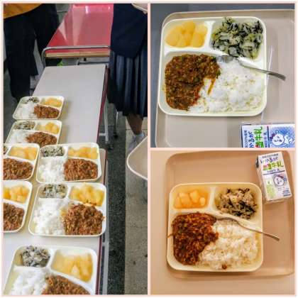 10月14日(火)、今日の給食献立は、大豆入りキーマカレーライス、キャベツのひじきドレッシング、和梨(カット缶)、牛乳です。エネルギー:776kcal。たんぱく質:28.5g。脂質:20.8g。糖質:112.3gでした。【今日の大豆入りキーマカレーライスには、「豚レバー(チップ)」を使っています。レバーには、不足しがちな鉄が多く含まれています。『レバーに多く含まれる鉄の主な働き』鉄は、血液中の赤血球に含まれるヘモグロビンの材料となります。赤血球は、全身に酸素を運ぶ働きがあり、貧血を予防します。】