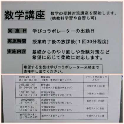 北館2階3年生教室のA教室で、学びコラボレーターの出勤日に合わせて、希望者がいれば、高校受験に向けての数学の勉強会が行われています。今回は、中間テストに向けての勉強会が行われていました。