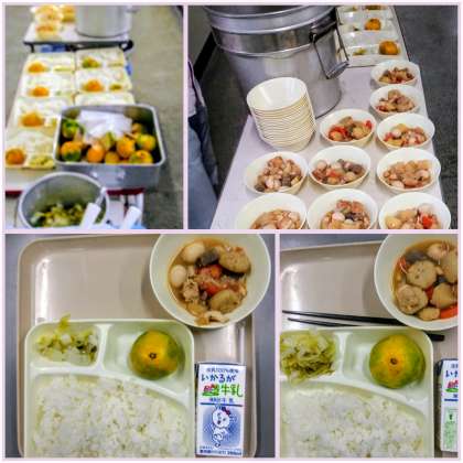 11月5日(水)、今日の給食献立は、ご飯、関東煮、白菜の甘酢あえ、みかん、牛乳です。エネルギー:738kcal。たんぱく質:29.9g。脂質:16.7g。糖質:110.3gでした。『関東煮』は、関西では、昔、味噌田楽(みそでんがく)のことを「おでん」と呼んでいました。現在では、だし汁と醤油などで煮込んだおでんのことを「関東煮」と呼んでいます。【今日の給食では、鶏肉やうずら卵、ゴボウ平天、じゃがいも、こんにゃく、厚揚げ、大根、人参を使用しています。】また、味噌田楽とは、豆腐やこんにゃくなどを串(くし)に刺して焼き、味噌を塗った料理です。